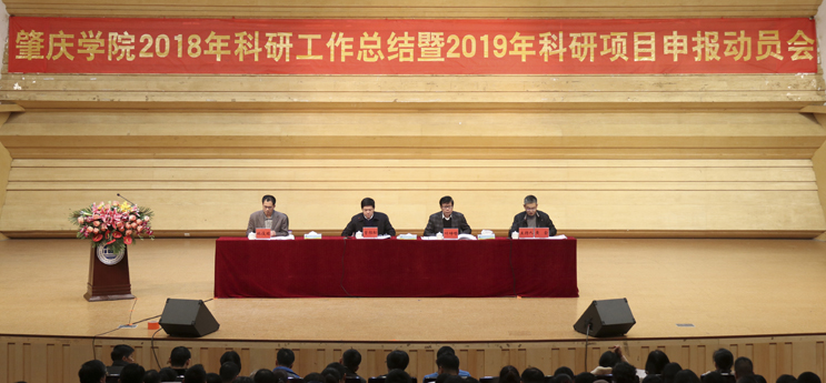 曾桓松作题为《坚定信念 发奋图强 行稳致远 决胜2020年》的大会讲话。他指出,2018年是科研工作的丰收之年,全校上下以习近平新时代中国特色社会主义思想为指导,深入推进高等教育发展内涵建设,在科学研究、学科建设、人才培养等工作中取得显著成绩,学校发展迈入新台阶。一是申硕工作全面启动,全校上下正全力以赴决胜2020年申硕目标;二是认真贯彻“冲补强”提升计划,以“补短板”为核心,推进各项工作,实施效果获得省委、省政府、省教育厅肯定;三是携手广东工业大学落实组团帮扶工作,借力高水平理工大学的人才优势,加快提升我校科研工作及学科建设水平;四是科研成果喜人,产量丰硕,量效并进,科研经费突破7000万元;五是服务地方经济社会成效显著,在人才智力支撑、助力新型能源产业发展、重大服务平台建设、决策咨询研究等方面都卓有成效,为促进地方经济社会发展做出积极贡献。