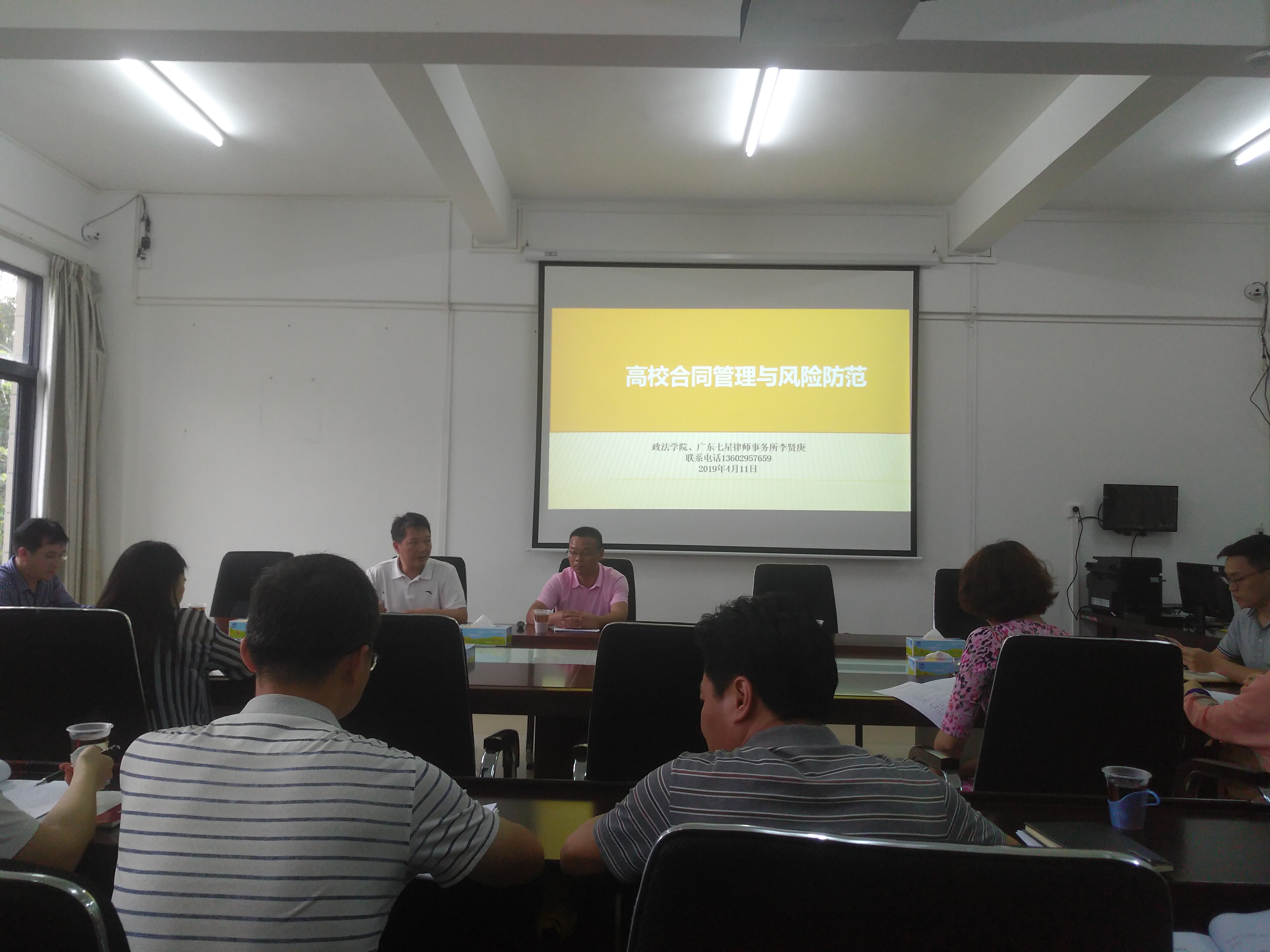 随后,法律顾问李贤庚律师就“高校合同管理与风险防范”的主题,通过合同管理释义、重要性、组织体系、基本制度、必备条款等多个方面展开讲授,并对日常管理遇到的问题作出回答。